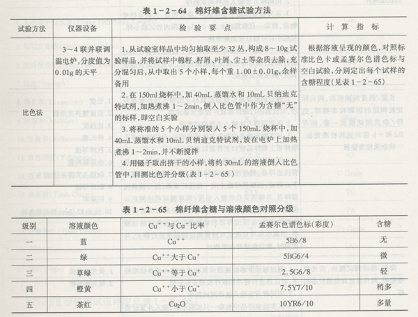 棉纤维含糖检验棉纤维含糖有内糖(即自身含有的“生理糖类”)和外糖(即附着表面的外源物质糖类)之别,内糖的含量受棉花品种遗传特性的影响,而外糖则受棉蚜、白蝇等昆虫排泄物污染和棉叶蜜腺分泌物的影响。棉纤维含糖将会在纺纱过程中产生粘性,严重影响可纺性和产品质量。目前我国测定棉纤维含糖的试验方法有比色法(GB/T 13758--1992)和定量法(GB/T 16258--1996),其中比色法简便实用,使用广泛,其试验方法见表1—2—64。