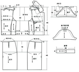 上衣成衣尺寸:肩宽:40厘米,胸围B:90厘米,衣长:45厘米,袖长:18厘米