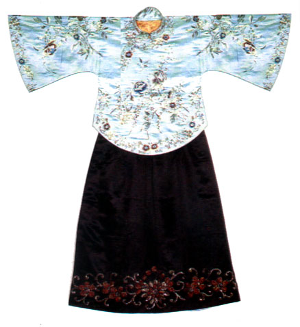 近代妇女袄裙 辛亥革命以后,女装在这一时期上衣下裙最为流行,上衣有衫、袄、背心、,样式有对襟、琵琶襟、一字襟、大襟、直襟、斜襟等变化,领、袖、襟、摆多镶滚花边或刺绣纹样,衣摆有方有圆、宽瘦长短的变化也较多。本图为圆摆、低领、宽袖短袄套裙穿戴组合展示图(传世实物)