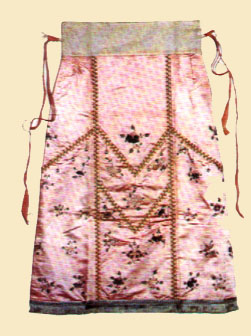 近代妇女袄裙 民国初年,在这一时期上衣下裙最为流行,上衣有衫、袄、背心、,样式有对襟、琵琶襟、一字襟、大襟、直襟、斜襟等变化,领、袖、襟、摆多镶滚花边或刺绣纹样,衣摆有方有圆、宽瘦长短的变化也较多。当时与袄相配穿的裙子的样式有马面裙、套裙等。本图为彩绣马面裙(传世实物)