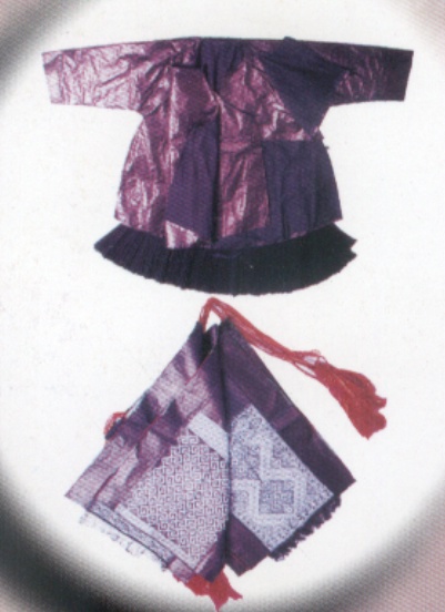 服饰 用自产藏青色亮布缝制。建国以来改为买纱自织自染。衣和裙无刺绣。衣无领,开右衽大襟,钉3至4颗布扣,条件好的用银、铜制扣。穿短裙,群皱多达七八百褶左右。冬季逢节日,一次穿上10余铺,使外层裙褶向上收缩、向外张开,如撑开的大伞状。 腰饰 包括腰带和围腰。腰带有黄、红、蓝赭黑等色,用5色丝线纱织成各种图案,可缠腰3周有余,带头有缨须,打结于腰后。围腰由大小4幅蔵青色亮布制成,绣有各种花纹图案。
