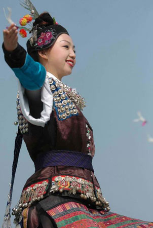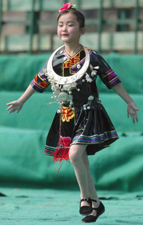 11月21日,贵州雷山县的一位苗族小朋友在展示苗族童装。当日是苗族新年的大年初一,贵州省黔东南苗族侗族自治州雷山县的苗族群众以“民族服饰秀”等多种方式欢度节日。(摄影/杨俊江)