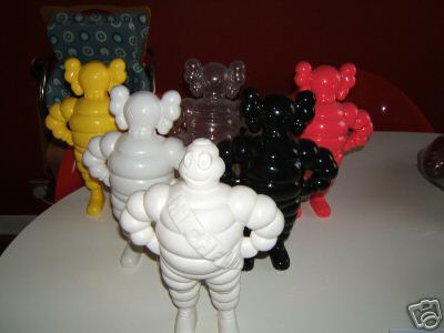 这套出现在Ebay上的Kaws Chum公仔就是以世界著名之Michelin米其林轮胎之标志改造而成。并且每个公仔均全球限量发售,据拍卖者声称此系列公仔的号码分别为:白色085/500(第二排第一个)、粉色342/500、黄色300/500、透明色658/1000及超限量的黑色款(附有Kaws的亲笔签名),珍贵程度可见一斑。 并且前排第一个的原版Michelin公仔则更是少见之作,光这一个‘小人’就足够买一双限量波鞋。