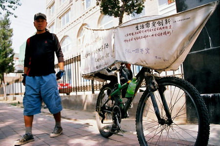 在东中华路路边,一辆装饰成鞋状的自行车吸引了路人的注意。这辆车前、后、右三面都被写着“拯救世界独一无二的中国鞋文化”、“为让56个民族的鞋子们走向世界而努力”,“走遍中国唯一寻鞋者:赵华”、“出发时间:2001年2月5日”、“四川绵竹”的广告喷绘布包围着。