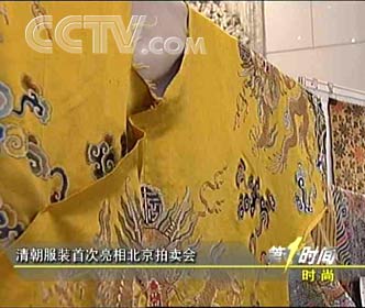 今天,一场集合了织绣品、书法油画、雕塑、工艺品翡翠、古代钱币等总共5000件物品的拍卖活动就要在北京拉开帷幕。据了解,在织绣拍卖品中,最引人注目的是清朝皇帝穿的衣服。想看看吗,一起和记者的镜头来看看。您现在看到的衣服就是雍正皇帝穿的龙袍,它是清朝的一位江南织造高手为雍正制作的龙袍,这件正明黄地绣万寿金龙袍上面绣有九条五爪龙纹,四周环绕着五彩祥云下摆还有一笔书成的“寿”字,寓意“福寿双全”。