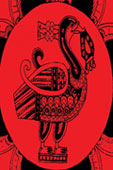 这件五彩鸟斜纹纬锦,以团形瓣窠作环,内置立鸟,站于联珠台上,颈上和翅上都饰有联珠授带,鸟嘴也衔有联珠授带,织物的背后还有纬线作背浮。同类织物在该墓中大量出土,因此,可将图案复原。这种含绶鸟当时被称作五色鸟,一般经线用两根或三根Z拈的紫色丝线作夹经,单根Z拈作明经,纬线用大红作地,蓝、绿、白、黄四色显花,有时则将五色分区换色,有时用更多的色彩显示,部分色彩的纬线则浮于背后。都兰出土的五色鸟锦中还有以各种纹样作团窠环,内置一对含绶鸟的图案。从另一件色彩及用线相同的条形织物所织的波斯文铭文来看,此锦可能为使用波斯文的中亚织工所织。
