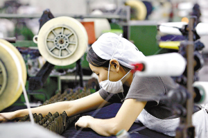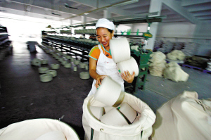 ![]() 广州第一棉纺厂一名女工正在将白色的纬纱接好。 |