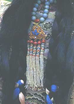 学纪,俗称“奶钩”,也有的叫作“肖桑”,是藏北青海牧区女子喜爱的佩饰。它原为藏族牧区女子挤奶桶的钩子,后来逐渐转变为实用和装饰双重作用的饰品。学纪形状如小铁锚,长约1尺左右,多为银质,上面镶有松石、玛瑙并雕有各种图案。藏族牧区女子无论居家或外出都喜欢随身佩戴,将其系于腰间,垂挂在左腹前。由于它的作用日趋偏于装饰,制作亦愈加精美。