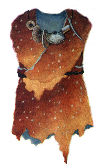 原始服饰:根据出土的骨针、骨锥等制衣工具想象复原的。在纺织技术尚未发明之前,动物的毛皮是人们服装的主要材料。当时还没有绳、线,可能用动物韧带来缝制衣服。在山顶洞人的遗址及其它古墓里,层发掘出大量的装饰物,其中有头饰、颈饰和腕饰等,材料有天然美石、兽齿鱼骨和海里的贝壳等,当时佩戴这些饰物,可能不仅是为了装饰,也许还包含着对渔猎胜利的纪念。