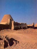 阿斯塔那古墓群位于吐鲁番东南约60公里处,由两个墓群组成,即阿斯塔那与哈拉和卓(即高昌)。它们是古代高昌王国城乡官民的公共墓地,它们均距火焰山不远,基本相接。二十世纪初,这两处墓地曾先后遭到英、俄、德、日等国掠夺者的疯狂盗掘,有不少纺织品已被带至域外,现收藏于伦敦大英博物馆和日本若干大学的博物馆中。