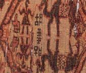 这件“胡王”牵驼锦是一件我国传统的平纹经锦,出土于高昌延昌二十九年(公元589年)唐绍伯墓中。整个图案以联珠圆环组成。在环内以朱红、墨绿、土黄三色显示一幅美丽的图案:一个商人执鞭牵驼来到泉水边,清澈的泉水中倒映出他完整的身影。织匠把商人在漫漫黄沙中发现泉