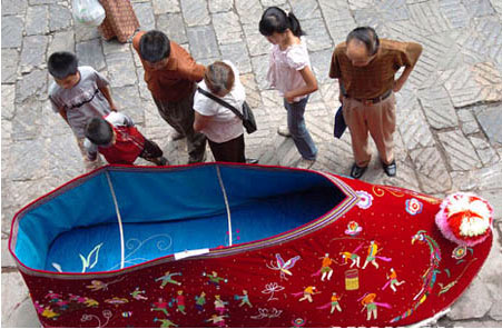 这只绣花鞋长3.2米,宽1.2米,高0.9米,采用毛南族特有的翘尖造型,鞋身图案展示了火龙节、猴鼓舞、板凳舞、放水灯等毛南族节庆活动场景。