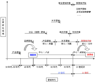 从全球范围看,工业化时代的商业模式(见图)近100年来的发展经历了诞生、发展、饱和、垄断、衰落这样一个周期;紧接着,倍速时代的新营销周期刚刚开始。