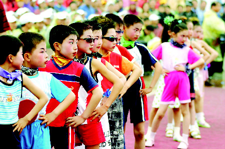 海安县实验小学认真落实对未成年人思想道德建设,大力推行素质教育,精简压缩作业量,还学生充足的课外活动时间。图为学校业余时装队表演的镜头。