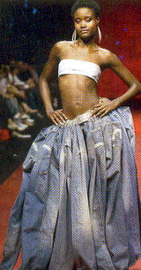 哇,第一眼看去,面前的这位美女仿佛是原始部落的公主。奇异夸张的大摆裙,把牛仔的粗犷演绎得淋漓尽致,有一种暴力的柔美,仔细看,上面还有许多口袋呢。穿上这样一条裙子,你未必要像Evisu的模特一样,以一件胸衣出镜,但那副野性的长耳环却是相当值得考虑的。