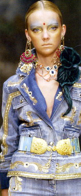 谁说雕龙绣凤的针法过时了?Angelo Marani的这套牛仔套装,将古典的霞帔幻化成眼熟的职业装款式,更是存心要颠覆配饰的“Less is more”原则,把耀眼的项链、耳环、花饰堆簇在一道,怎样的贵妇人才担当得起这样一种华丽?