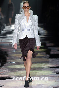 Tom Ford在Gucci的最后一场发表会,众人无不期待;自从Ford掌管设计大权后的鲜明风格,不但让Gucci重回时尚指标的行列,更使他个人事业如日中天。无庸置疑,在Ford手中的女人是自信骄傲、且欲望无穷的;繁复精细的材质拼接、剪裁立体合身的黑色缎面裙装、胸前以折边和毛皮装饰,线条刚硬的收腰夹克使用极度奢华的染色狐毛、麂皮和针织布料,宽大俐落的肩线和菱角分明的大型领口,架势凌人。