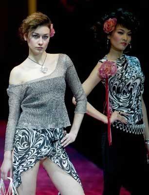 4月5日,在北京中国国际展览中心举行的“第12届中国国际服装服饰博览会女装展”首场时装秀上,两位模特展示法国著名女装品牌EMU的时装。这场时装秀的主题为“邂逅在赛纳河畔”。于3月30日正式拉开帷幕的“第12届中国国际服装服饰博览会”展出面积、参展厂商均超过往届,并首次将男女装分开展示。