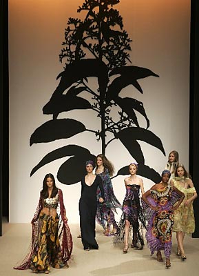 在巴西圣保罗时装周的活动中,模特们在装饰有树木剪影的T型台上演绎设计师利马的2005秋冬时装作品。