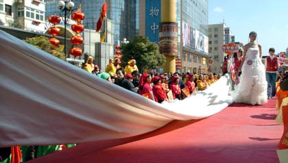 南京,2005年3月4日 50米长婚纱亮相南京。