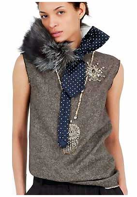 胸针要闪!要大!秋冬重夸饰,身上的配件是决定整体造型“完成”与否的重要关键,新式胸针采用了大量的碎钻、宝石,甚至是略带陈旧感的金属材质,除圆形之外,花朵、昆虫、动物、珍禽全是诉求;DKNY是甲虫、Anna Sui是蝴蝶、Ralph Lauren是飞禽、Valentino有猫头鹰和蜥蜴、Stella McCartney是长角鹿,动物一家亲,全在女孩儿身上见真章。