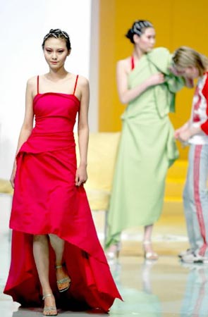 4月3日,一位模特在北京举行的2004/2005秋冬中国国际时装周的一场时装发布会上展示设计师现场搭配的时装。这场非时装生产行业主办的时装秀融入作画、现场搭配时装等多种时尚元素,也是本次时装周进行的最后一场具有时尚元素的时装秀。