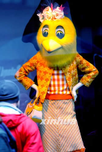 3月28日,一位游客在纽约第五大道观赏一家商店橱窗内的卡通造型时装展。位于纽约曼哈顿的第五大道是世界著名的商业街,沿街的橱窗展示千奇百怪,精彩纷呈。第五大道上各家名店的橱窗文化已成为游客观光购物不可或缺的内容。