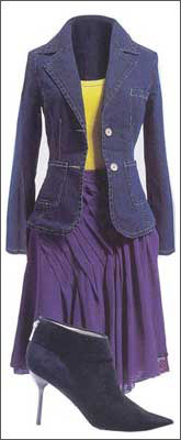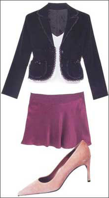| 花呢套装上衣:Coozi/蕾丝背心:MNG/丝缎衬衫:MNG/花呢半身裙:Coozi/纹理高跟鞋:Aee | 牛仔小外套:asis /明黄背心:Marccain/薄纱半身裙:New Romantic/短靴:BCBGirls | 灯芯绒短外套:ICE Girl by ECI /背心:Jockey/丝缎短裙:Genes/船鞋:Agnes B |