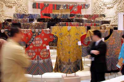 一件清朝江南织造高手为雍正皇帝制作的龙袍正在昆仑饭店展览,并将于本月15日的嘉德公司春季拍卖会上拍卖,估价18万至25万元。