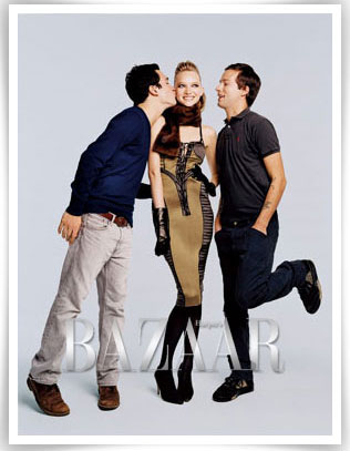 (年轻的时尚红人——Lazaro Hernandez(左)、Jack McCollough (右)和 Gemma Ward。 连衣裙、貂皮围巾 Proenza Schouler 手套 Portolano Products Inc. 紧身T恤Wolford 平底鞋 Manolo Blahnik for Proenza Schouler)