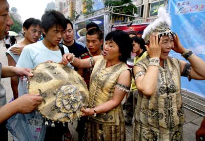 日前,在北京王府井步行街,来自黑龙江省赫哲族的两位老妈妈身着具有民族特色的鱼皮服饰,向步行街上的游客进行展示和介绍,为黑龙江民族风情旅游推介活动增添了浓郁的民族风情。