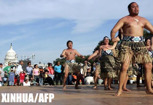 一些来自新西兰的演员在美国印第安人博物馆的开馆仪式上表演舞蹈