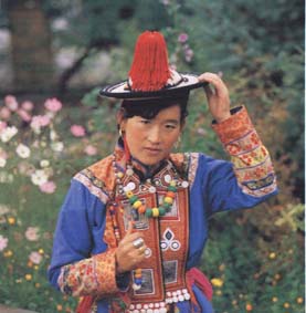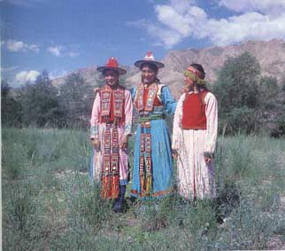 裕固族妇女的头饰颇富有民族特色。当姑娘到了15岁时,要戴“萨达尔格”,意味着姑娘长大成人,可以婚配了。“萨达尔格”是在用红布做成的一块方形布牌上,缀以贝壳和各色珊瑚而成。