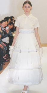 在2007 年的巴黎春夏时装秀上,川久保玲的爱徒Tao Kurihara 用两条梦幻般的纸艺裙令一台小型编外秀被挤得水泄不通,由于场地狭小,许多时尚圈人士不得不冒雨挤在窗外把整场秀看完。这位腼腆的年轻设计师操刀的Tao COMME DES GARCONS 本季推出一个“衬衫与婚礼服”的全白甜美系列,在秀的末尾,两位模特穿着长及脚踝、高束至胸下的蛋糕裙登场,那根本是两件庞大的纸工艺品,裙子上不计其数的蝴蝶结、细褶和流苏全靠剪刀浆糊完成。