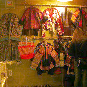 基诺族的衣服,因为是民族服饰,自然大多是以手绣为主。颜色明亮的较多。艳红、艳蓝。虽然是民族的东西,但绝对是与"土气"无关。时尚感很强。是一种民族与时尚的结合。还有漂亮的靴子。全部是手工的。我们可以单选一双靴子,配普通的牛仔裤。可以单选一件上衣。这也是店主的建议。虽然民族的东西会有意想不到的味道,但若真的全部武装也肯定会有意想不到的回头率,而这些对我们来说,稍有些严重了。结论,最佳搭配就是:单穿。