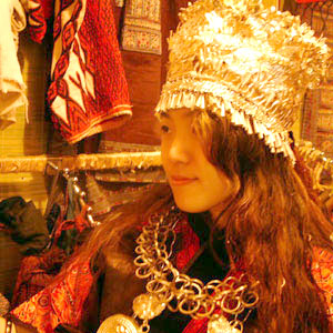 基诺族稍稍有些隆重的头饰,虽然不适合日常生活,但是戴上它拍张照片还是感觉非常不错喔。店主人很好,如果你想学我一样拍照片,只要跟她商量一下,相信她会答应的。这可是省了我们专程去云南试戴的路费呢。
