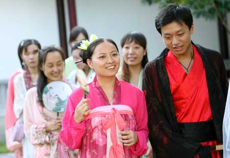 昨天下午3时,在余姚“天下玉苑”景区,20位金报读者和宁波的汉服爱好者在“月老阁”聚集,举行了别开生面的“七夕”仪式。