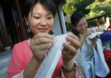 “一苇渡江”、“穿针引线”……仪式再现了古时汉族少女的闺阁生活,“古为今用”的创意,“时空变换”的手法,为现代人的情感生活增添了浓烈的古典韵味。汉服爱好者“水莲花”(网名)带来的几套汉服,也许在此时此地更加激发了人们的“古之怀想”,被前来参加此次“七夕”活动的时尚女性们一抢而空。