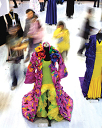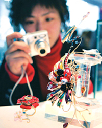 昨天下午与近代童装展同时开展的东华大学第二届首饰设计大赛和韩国启明大学面料设计展,前者以“空间”和“奥运”为主题,不乏貌似耳机的水钻耳环,或形若屋檐的合金项圈;后者用手织的方式演绎韩国学生对面料的组合尝试。(胡晓晶/文)