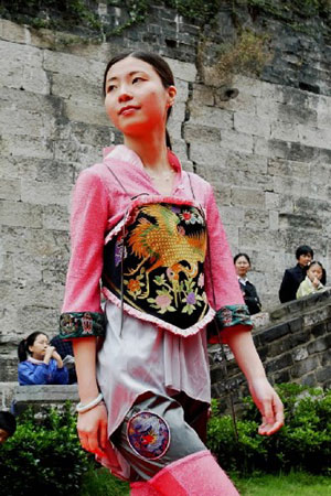 5月1日,一位模特身着云锦时装在南京中华门城堡表演。南京云锦被誉为“东方瑰宝”,已有1500多年的手工织造历史,而建于明代的中华门城堡也是南京著名的历史景点。在古堡内表演云锦时装,给观众带来全新的艺术享受。