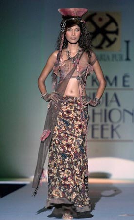 5月1日,在印度首都新德里举行的2004年印度时装周的一场表演上,一模特在展示著名设计师卡塔尼娅·普里的服装作品。近些年来,印度时装业发展迅速,每年以25%的速度增长。此次印度时装周吸引了400余名来自印度国内及海外的服装经销商前来选购印度设计师的服装作品。