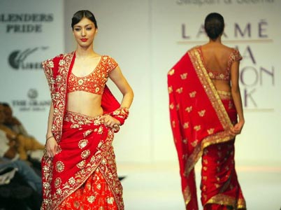 5月2日,在印度首都新德里举行的“2004年印度时装周”一场时装表演上,模特们展示印度时装设计师设计的印度传统服装“纱丽”。纱丽是印度女性最常穿的传统民族服装。