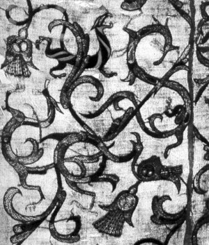 目前能看到的刺绣实物最早的当然要数荆州战国楚墓出土的“龙凤虎纹绣罗”了(见左图)。这是一幅罗地上用锁绣法表现的作品,保存完好。另外还有同墓出土的龙凤纹绣绢、湖南长沙烈士公园出土楚国刺绣,也保存得很完好,这是认识古代刺绣的最好资料。在稍后的汉墓出土文物中,绣品更多了,如马王堆西汉文物中就有绣花绢绵袍、黄绣花袍,所用绣线极细,是前所未有的。