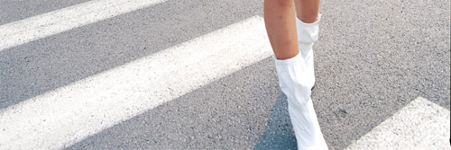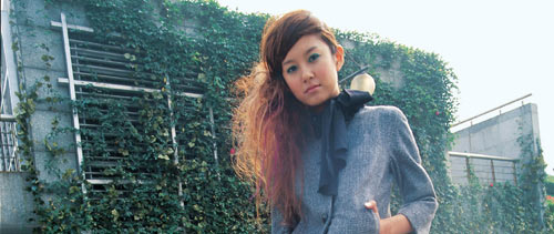 细小比例的千鸟格图案令灰色毛料上衣的细节处颇值得推敲,领口的丝带结和短裙褶边以不对称方式打破灰色的单调氛围。灰×黑色千鸟格纹上衣/ MOSCHINO 11700元,黑色皮裙/BENETTON(未定价),白色皮靴/热风 380元。