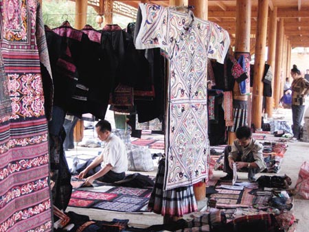 留守在凯里的施洞商人,多半在金泉湖民族工艺品市场上拥有自己的摊位,他们向游客出售绣片、背儿带、苗族服装,有的绣片是新做的,特意做旧,冒充古老绣品叫个高价,普通的游客难辨真假。真正年代久远的精美苗服,被定期回凯里的商人买走带到北京、上海,再由他们卖给识货的藏家。