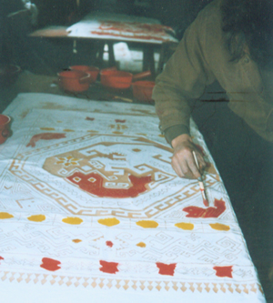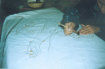 点蜡的方法,把蜂蜡放在陶瓷碗或金属罐里,用火盆里的木炭灰或糠壳火使蜡融化,便可以用铜刀蘸蜡作画。目前很多地区都是是照着纸剪的花样确定大轮廓,然后画出各种图案花纹。
