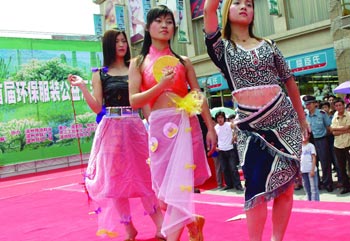 前天(6日)上午,温州市首届环保服装公益汇演在市区时代广场前举行,温州师范学院、浙江工贸职业技术学院的数十名学生展示了用废旧塑料袋、快餐盒、废画报、报纸等材料制成的“环保服装”,以此呼吁人们保护环境。活动由市环境保护局、市绿色志愿者协会(筹)等共同举办。