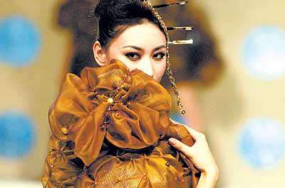 在第53届世界小姐季军关琦在“汉帛奖”第12届国际青年设计师时装作品大赛中登场。这场比赛正式拉开了中国国际时装周2004/2005秋冬系列发布会的帷幕。在决赛中,来自19个国家的33位年轻设计师进行了激烈的角逐,最后,来自北京的25号选手胡劢凭作品《时尚新贵》夺取金奖。(张珂/摄)