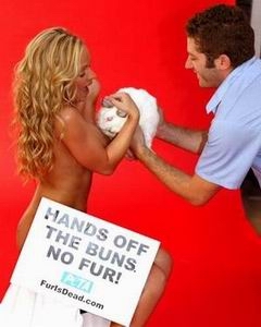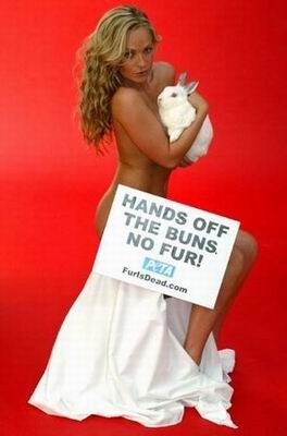 3月25日,澳洲著名模特儿伊莫金贝利(Imogen Bailey)在悉尼搂着一只小白兔拍摄“善待动物者”组织(PETA)宣传不要穿戴动物皮毛的海报照。