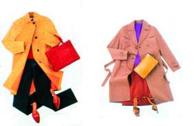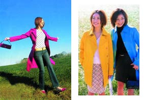 上左:玫瑰红大翻领风衣配玫瑰红尖头鞋,玫瑰红让休闲服饰也有了浪漫的女人味。